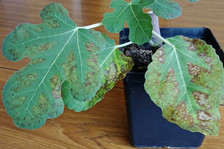 Hoci figovníky nezvyknú trpieť chorobami, predsa sa môžu na listoch objaviť škvrny. Tie môžu signalizovať hrdzu, alebo vírusovú mozaiku.