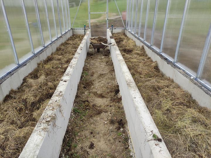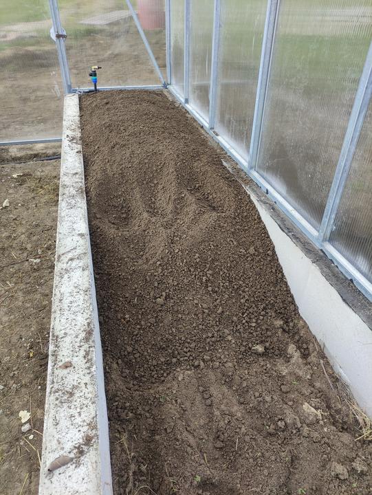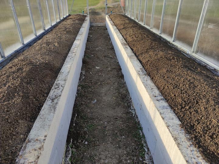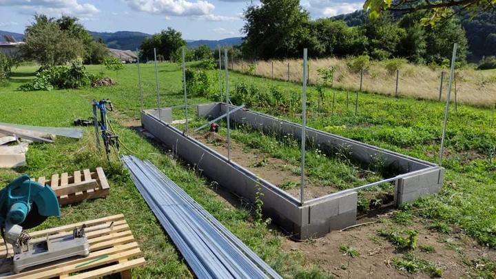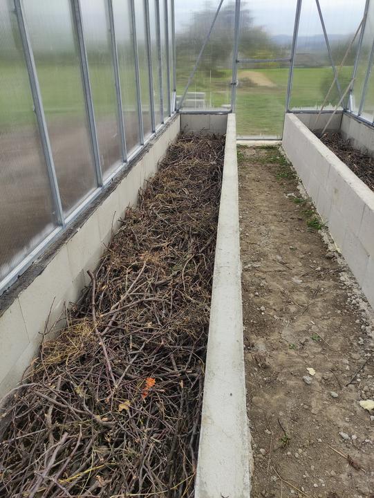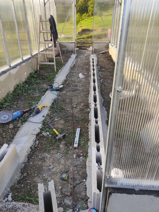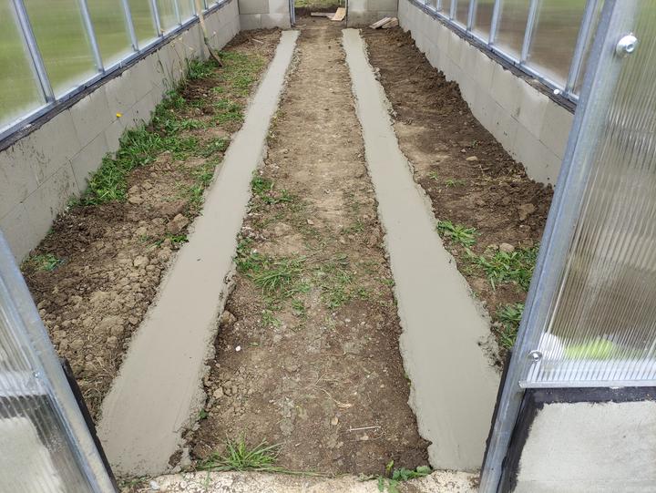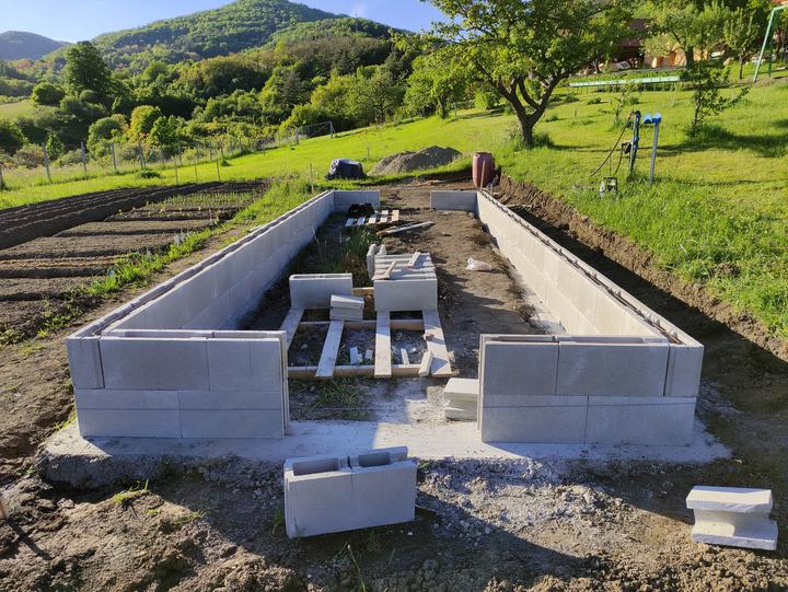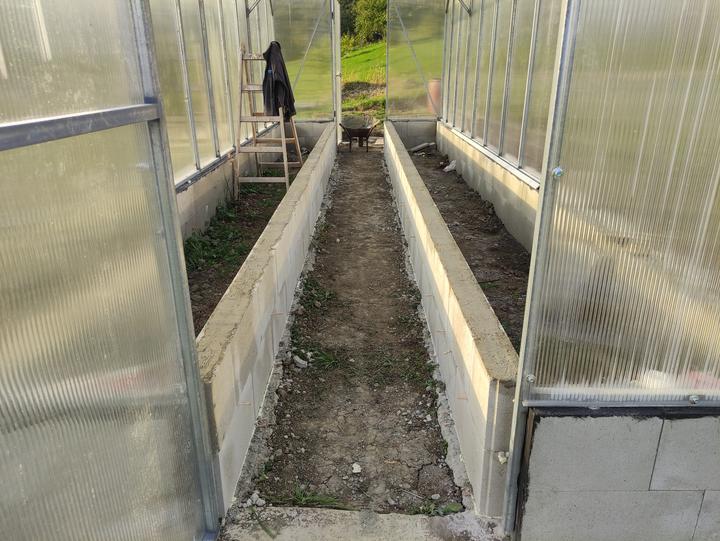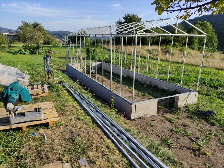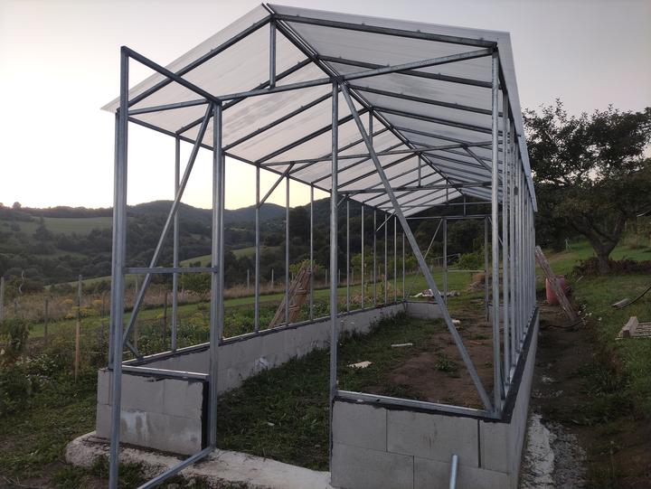 Sklenik je ako drobná stavba do 25 M2 rozmer 8,4x2,9 základ je asi 70 CM hlboký, do základu som dal koše zo strmienok a 10 MM roxorov ,polykarbonát je 10 MM 2 uv. Na skleník som minul cca 200 m pozinkovanej jokloviny 30x30x2 mm,zvary som pretieral Zingou ,do skleníka je natiahnutý prívod vody na kvapkovu zavlahu .. možno by veľa z vás urobilo veľa veci ináč..toto je zhruba podľa mojich potrieb ...na spodok záhonov som dal iba konáre a mierne uhnite seno ..nedával som nič proti hrabosom ani krtkom keďže základ je relatívne hlboký ..pôdu som si vyrábal podobne ako pri jahodách a malinach zmiešaním ornice ,piesku a hnoja rotavatorom..záhony sú hlboké 50 CM široké 80 CM a dlhé 8,4 metra ..chodník je na šírku furika ..do skleníka vošlo okrem konárov a sena okolo 120 furikov zeminy .