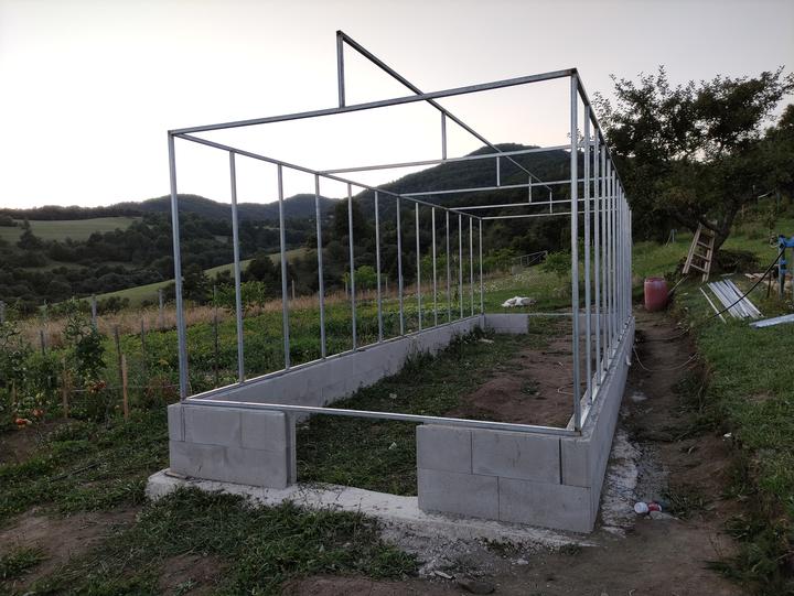 Sklenik je ako drobná stavba do 25 M2 rozmer 8,4x2,9 základ je asi 70 CM hlboký, do základu som dal koše zo strmienok a 10 MM roxorov ,polykarbonát je 10 MM 2 uv. Na skleník som minul cca 200 m pozinkovanej jokloviny 30x30x2 mm,zvary som pretieral Z…