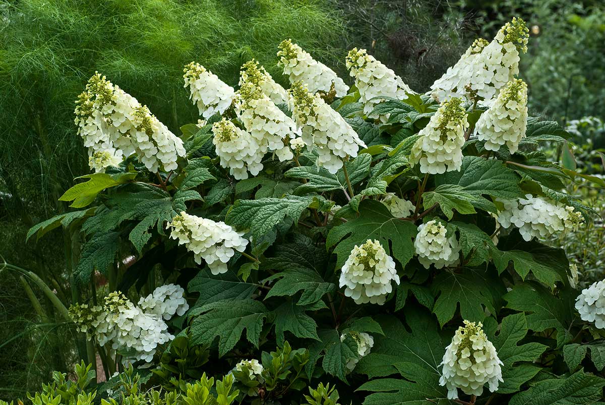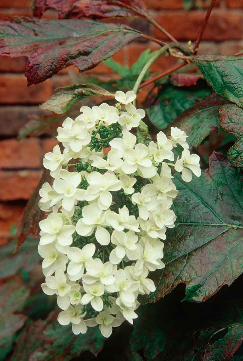 Kultivary hortenzie dubolistej (Hydrangea quercifolia) majú veľké listy tvarom pripomínajúce dub, ktoré na jeseň sfarbujú do ohnivých tónov. Biele kvety tvoria bohaté kvetné klasy a staršie rastliny majú atraktívnu olupujúcu sa kôru.