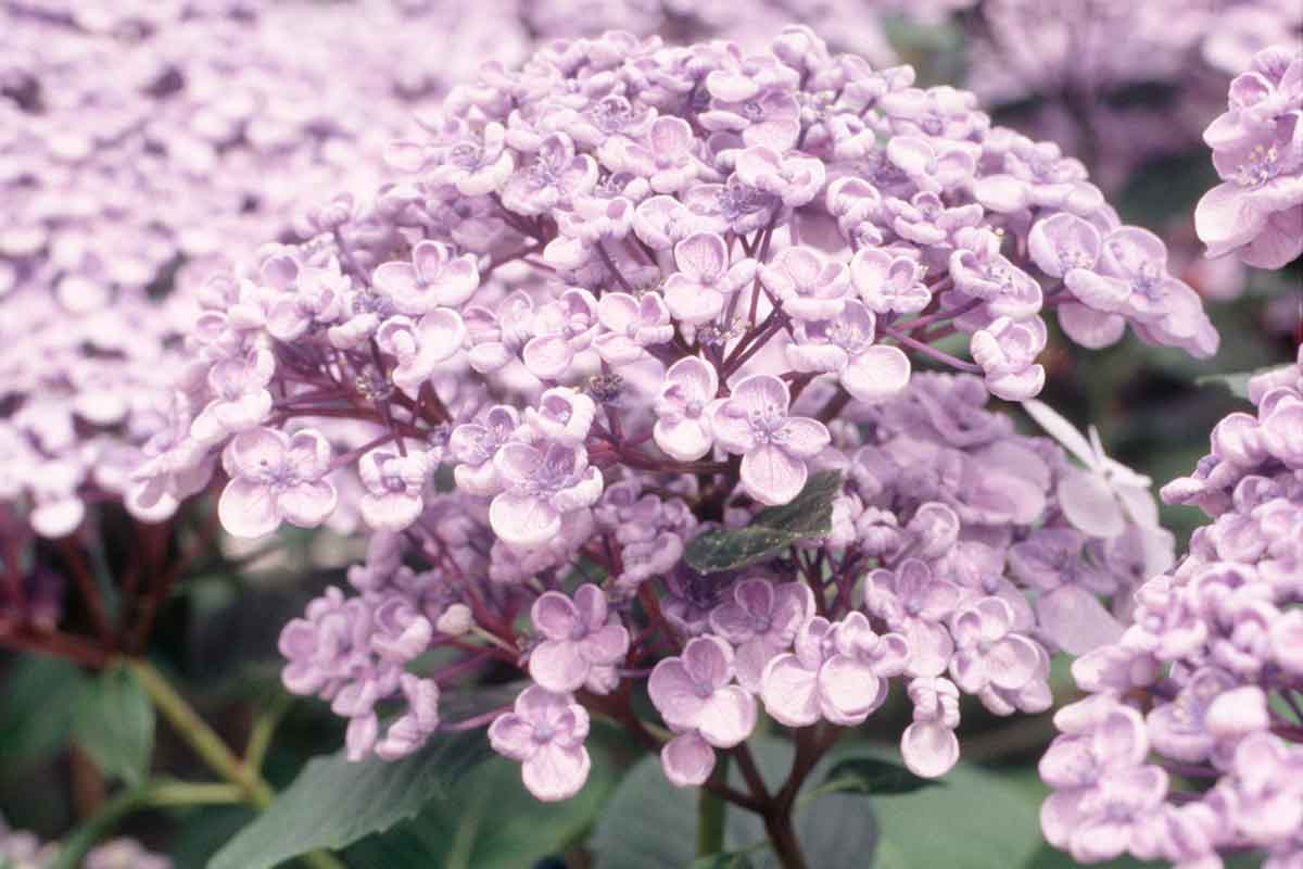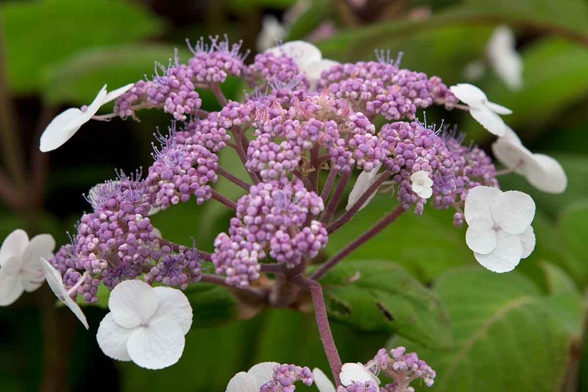 Drobné modrofialové kvietky lemujú veľké ružovofialové okrajové kvety. Listy tejto čipkovanej hortenzie sa na jeseň sfarbujú do červena.