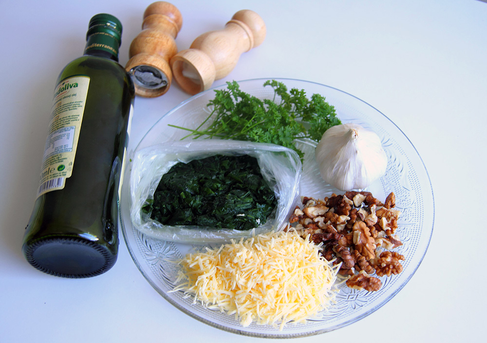 Najskôr si na suchej panvici opražíme orechy, aby sa krásne rozvoňali a pustili svoj olej. Do mixéra dáme petržlenovú vňať, opražené, no nie horúce orechy, pretlačený cesnak, nastrúhaný syr a dochutíme soľou a korením. Celú zmes rozmixujeme. Olej pridávame postupne iba po malých množstvách tak, aby nezostalo pesto príliš riedke ale naopak, malo by byť hustejšie.