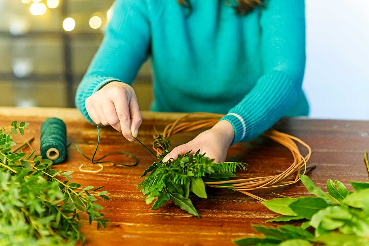 Na výrobu takéhoto „šťavnatého“ zeleného venca budeme potrebovať obruč z brezových vetvičiek, na ktorú pomocou záhradného drôtika postupne pripevníme vetvičky tisu, vavrínu alebo aj vavrínovca, cezmíny a vetvičky s plodmi šípok. Pridať môžeme aj vetvičky obrastené lišajníkmi.