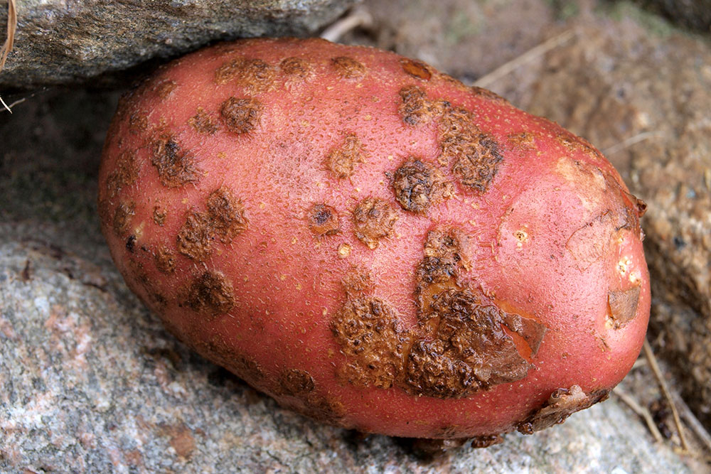 Drobné, niekedy vyvýšené, chrastovité škvrny na šupke zemiakov naznačujú napadnutie hubovým patogénom Streptomyces scabies. Pri slabom výskyte si poškodenie na prvý pohľad nemusíme všimnúť, ale po umytí hľúz je dobre viditeľné. Pri silnom napadnutí sa zhoršuje skladovateľnosť hľúz, pretože sa v sklade zvykne pridať hniloba. Napadnuté hľuzy je po olúpaní možné konzumovať.