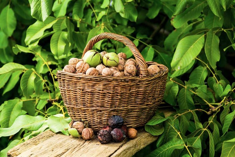 So zberom začneme, keď plody prirodzene opadávajú. Zberáme ich spod stromu, obíjame palicou v korune. V rukaviciach očistíme od zelených šupiek. Pred dlhodobým skladovaním ich dôkladne vysušíme v jednej maximálne, dvoch vrstvách a chránime pred myšami.