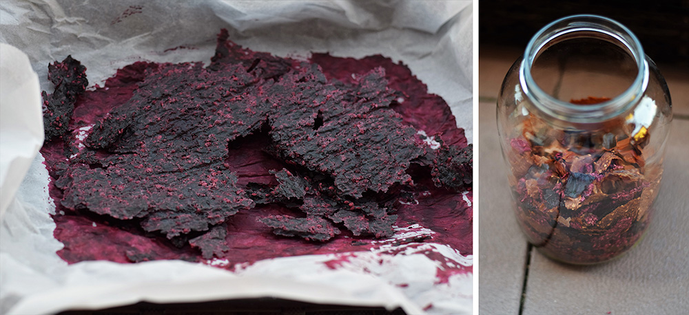 Pri výrobe ovocných koží som nesušila len samotné kože, ale aj všetko, čo ostalo po pasírovaní ovocia na ne. Kúsky šúp, zrniečka a na tom všetkom sa zviezlo aj kus dužiny. Černice, ríbezle, myrobalány, slivky, kúsky jabĺk… Všetko, čo ostalo v site po pasírovaní z mixovaného ovocia.