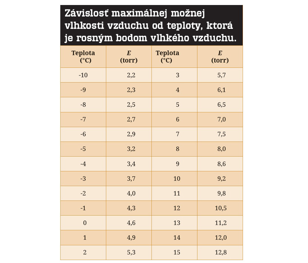 Napríklad o 18. hodine sme namerali v ovocnom sade teplotu 7 °C a relatívnu vlhkosť 50 %. V tabuľke zistíme, že pre 7 °C sa hodnota „E“ rovná 7,5 torru. Hodnoty dosadíme do vzorca.
