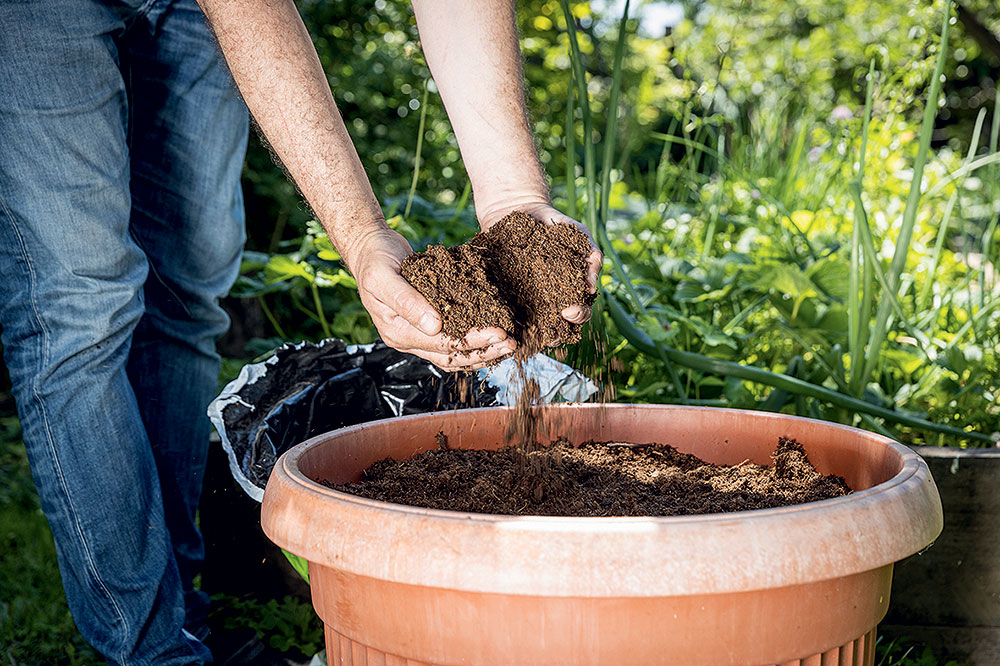 Na dno pestovateľskej nádoby s odtokovými otvormi nasypeme keramzit a následne naplníme, nie tesne po okraj, čerstvým záhradníckym substrátom.