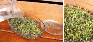 Postup je jednoduchý. Materinu dúšku jemne prepláchneme vodou, aby sme sa zbavili nečistôt a prípadne aj drobného hmyzu. Nastriháme ju na polovicu, čím sa ešte viac rozvonia, pretože pustí silice a namočíme ju do vychladnutej prevarenej vody. Necháme lúhovať spolu s kyselinou citrónovou približne 24 hodín.