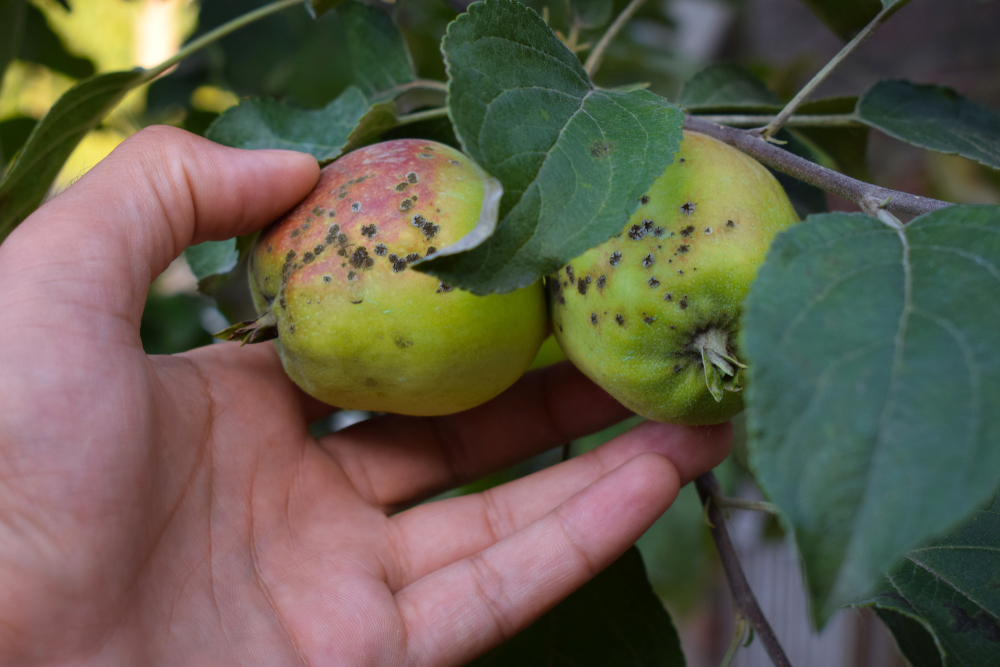 Podľa všetkého je vaša jabloň napadnutá chrastavitosťou jabĺk, ktorú spôsobuje huba Venturia inaegualis. Ak pre ňu nie sú veľmi priaznivé podmienky, huba napáda len listy, ktoré majú typické čierne škvrny. Po daždivej jari, a v tomto roku bol máj mimoriadne daždivý, sa dokáže infekcia hravo rozšíriť aj na plody, zdeformovať ich, posiať čiernymi škvrnami a spraviť z nich nejedlé.