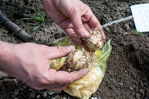 Ak boli hľuzy dlhšie skladované v suchu, pred výsadbou ich namočíme. Na pár hodín ich ponoríme do vedra s vodou a necháme dobre nasiaknuť.