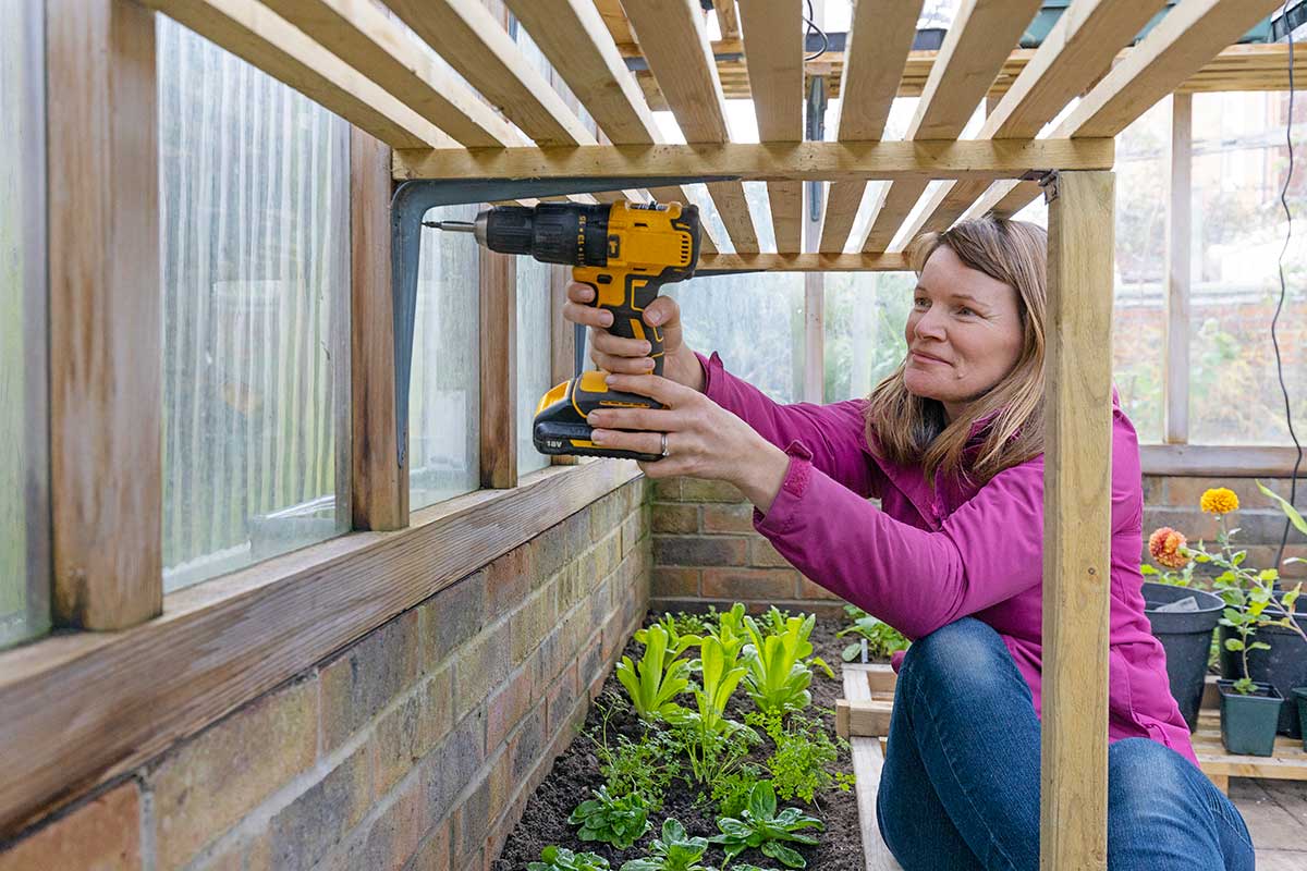 Nainštalujeme poličky, aby sme na ne prípadne mohli zo studenej podlahy zdvihnúť kvetináče s citlivými rastlinami. Keď klesne teplota krátkodobo pod bod mrazu, použijeme vykurovacie rohože.