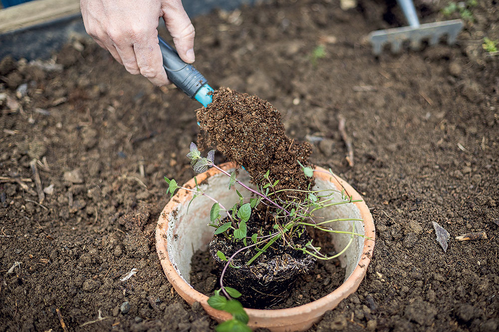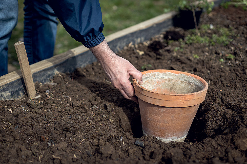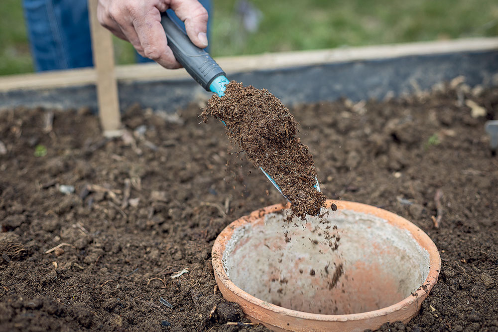 Črepník naplníme do asi dvoch tretín kvalitnou kompostovou zeminou zmiešanou s okolitou pôdou.