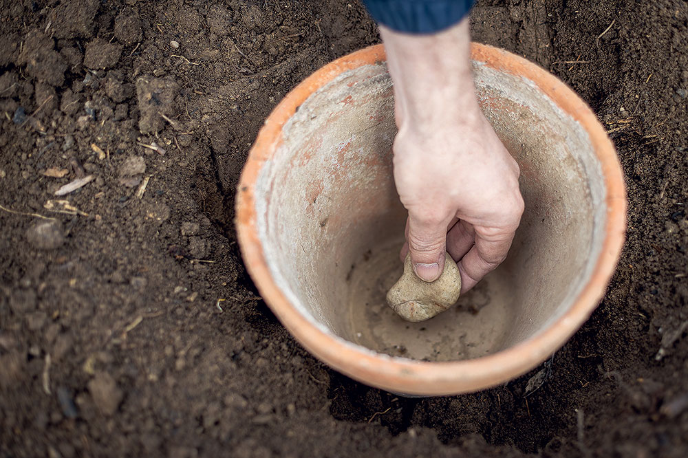 Na mieste výsadby vyhĺbime rýľom väčšiu jamu a vložíme do nej pripravený hlinený črepník.