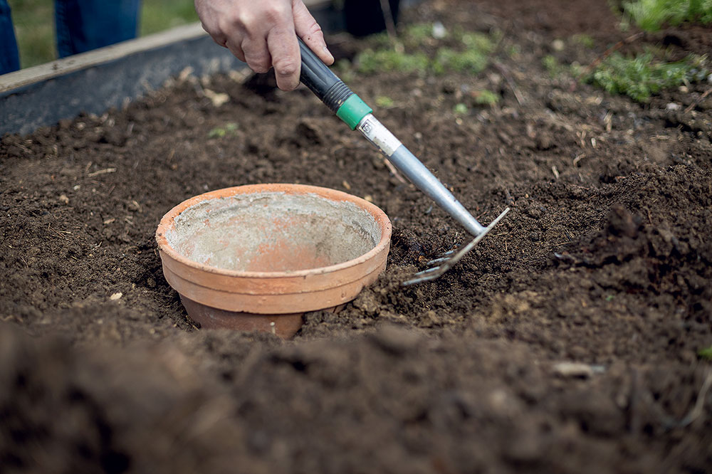 K zapustenému črepníku prihrnieme pomocou ručných hrabličiek pôdu, ktorú sme vykopali, a zľahka utlačíme.