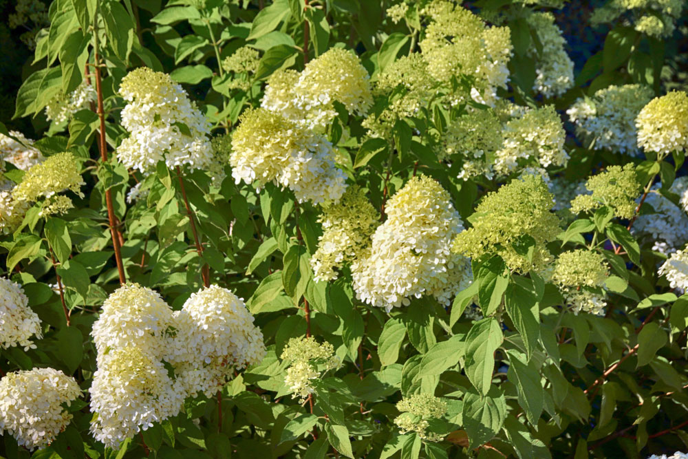 Slnečné stanovište dobre znáša hortenzia metlinatá (Hydrangea paniculata). V lete tvorí výrazné kvetné súkvetia s typickým pretiahnutým, trochu ihlanovitým tvarom a krémovej bielej farby. Neskôr sa sfarbia do ružova. Ker je v porovnaní s ostatnými hortenziami trochu väčší, môže dorastať až do 4 či 5 m. V menších rozmeroch ho môžete udržiavať rezom alebo zvoľte nízkorastúci kultivar. Buď skrátite všetky konáre skoro na jar vo výške cca 30 cm nad zemou, alebo ho ostriháte „do postupna“. Rozkvitá na nových výhonoch.