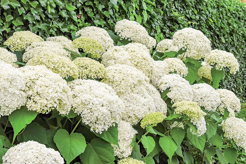 Slnečné stanovište dobre znáša aj hortenzia stromčekovitá (Hydrangea arborescens), konkrétne kultivar Annabelle s veľkými súkvetiami. Dorastá do výšky aj šírky 1 až 1,5 m. Na dobrý rast sa odporúča mierne kyslá pôda a v predjarí jarný rez až o tri štvrtiny výšky kra.
