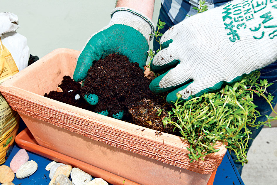 Na pripravenú prvú vrstvu substrátu dáme prvú bylinku – tymián. Opatrne ju vyklopíme z črepníka, v ktorom bola pestovaná, a uložíme ju aj s koreňovým balom na substrát.
