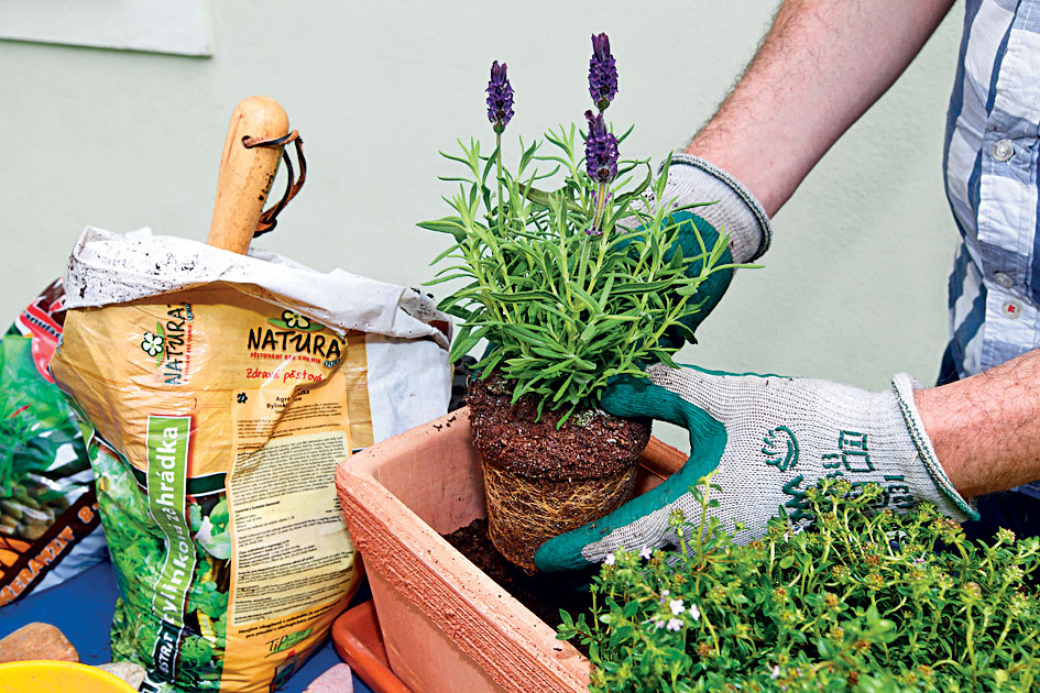 Pokračujeme levanduľou. Opäť si ju najprv opatrne vyberieme z črepníka a uložíme bal na vrstvu substrátu. Rastlinu neťaháme nasilu.
