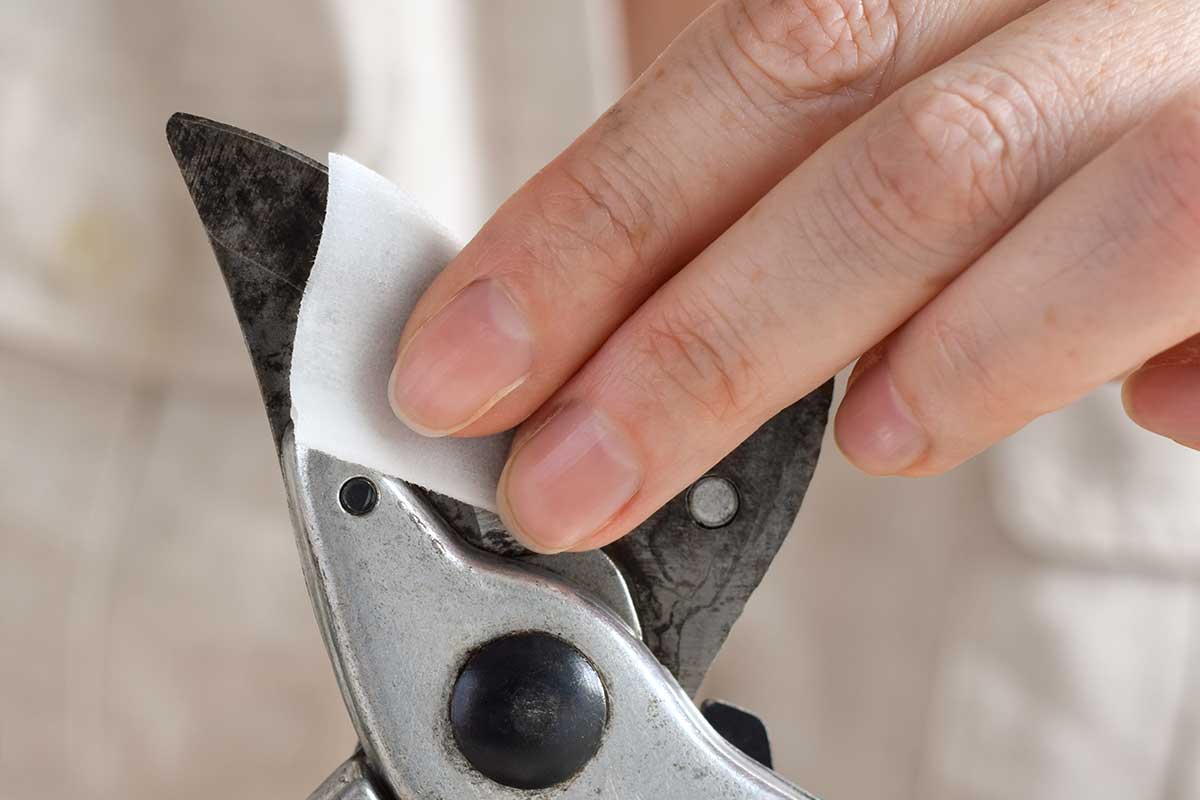 Čepele nožníc stačí utrieť handričkou alebo vatovým tampónom navlhčeným v liehu a nechať krátko pôsobiť. Dezinfekciu je vhodné opakovať pred prechodom na ďalší strom, najmä ak je napadnutý chorobami.