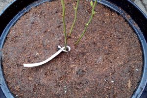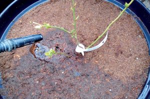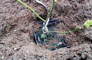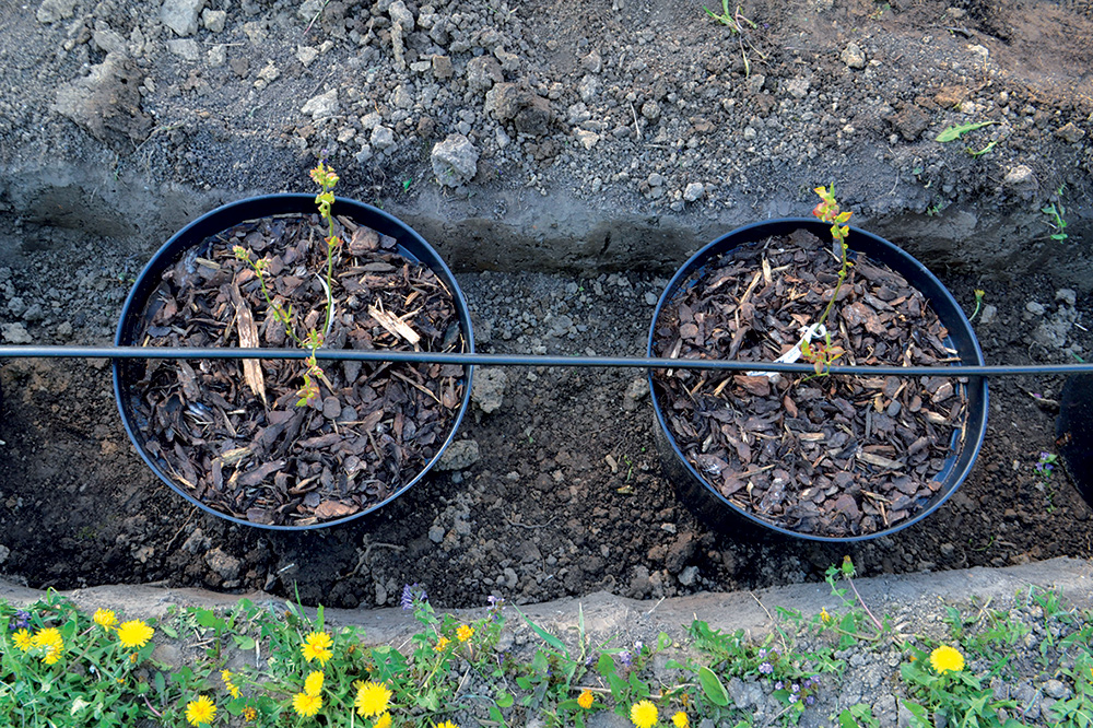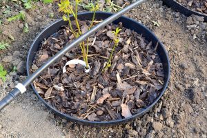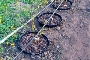 Pokiaľ máme vo výsadbovom rade už vybudovanú kvapkovú závlahu, spon výsadby prispôsobíme kvapkovým labyrintom, aby voda kvapkala len do nádoby a nie mimo.