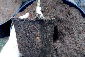 Sadenicu opatrne vyberieme z kontajnera a skontrolujeme koreňový systém. Ten by mal byť zdravý, bohatý a mal by prerastať celý objem kontajnera.