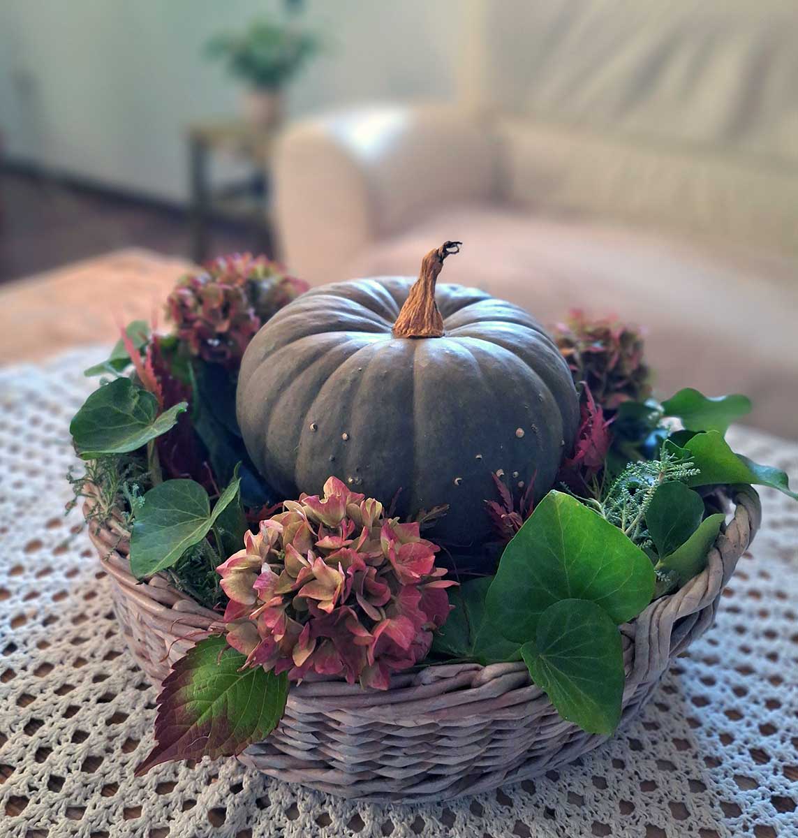 Na jesennú dekoráciu využijeme plytký prútený košík alebo podnos. Do stredu umiestnime tekvicu, okolo ktorej poukladáme listy brečtanu, rôzne konáriky, suché kvety hortenzie, a položíme na stôl. A jednoduchá dekorácia je na svete.