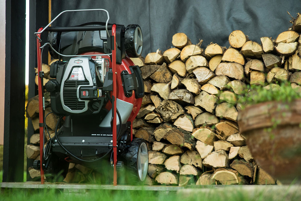 Najnovší systém MowN’Stow® patentovaný firmou Briggs & Stratton umožňuje unikátny spôsob skladovania kosačky so spaľovacím motorom VO ZVISLEJ POLOHE. Je to v súčasnosti jediný spaľovací motor na trhu, vďaka ktorému je možné kosačku postaviť vo zvislej polohe, bez rizika úniku oleja alebo paliva.