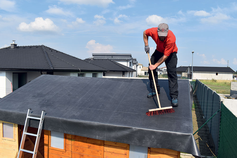 7. Po zatvorení lepeného povrchu membránou sa pomocou metly zabezpečí rovnomerný kontakt oboch lepených plôch.