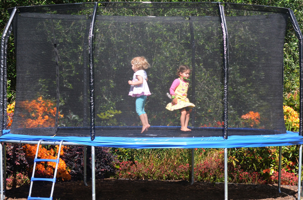 Záhradné vybavenie, ktoré sa najviac spája s detskými zraneniami v záhrade, sú trampolíny. Nevyhnutná je bezpečnostná sieť. Tiež je dobré stanoviť si nejaké pravidlá týkajúce sa počtu osôb, ktoré môžu byť v jednej chvíli na trampolíne. Je tiež dôležité, aby dospievajúci a dospelí nechodili na trampolínu súčasne s malými deťmi.