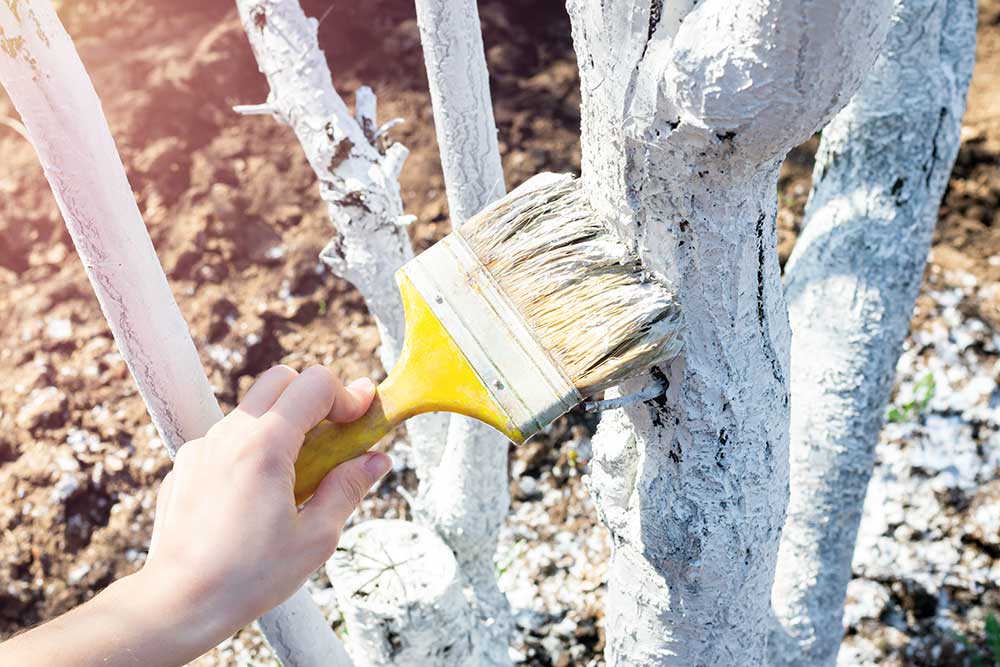 - Kmene ovocných stromov ošetríme kvalitným bielym náterom. Tým zabránime nežiaducemu prehrievaniu a praskaniu kôry počas striedania zimných mrazivých nocí a teplejších dní.