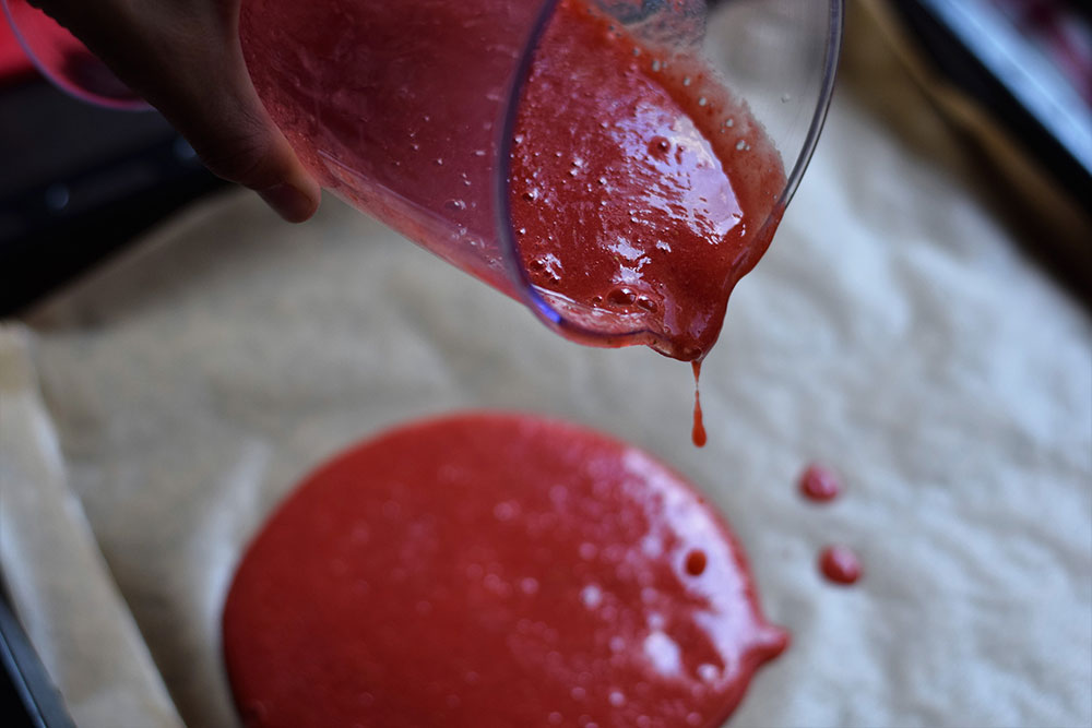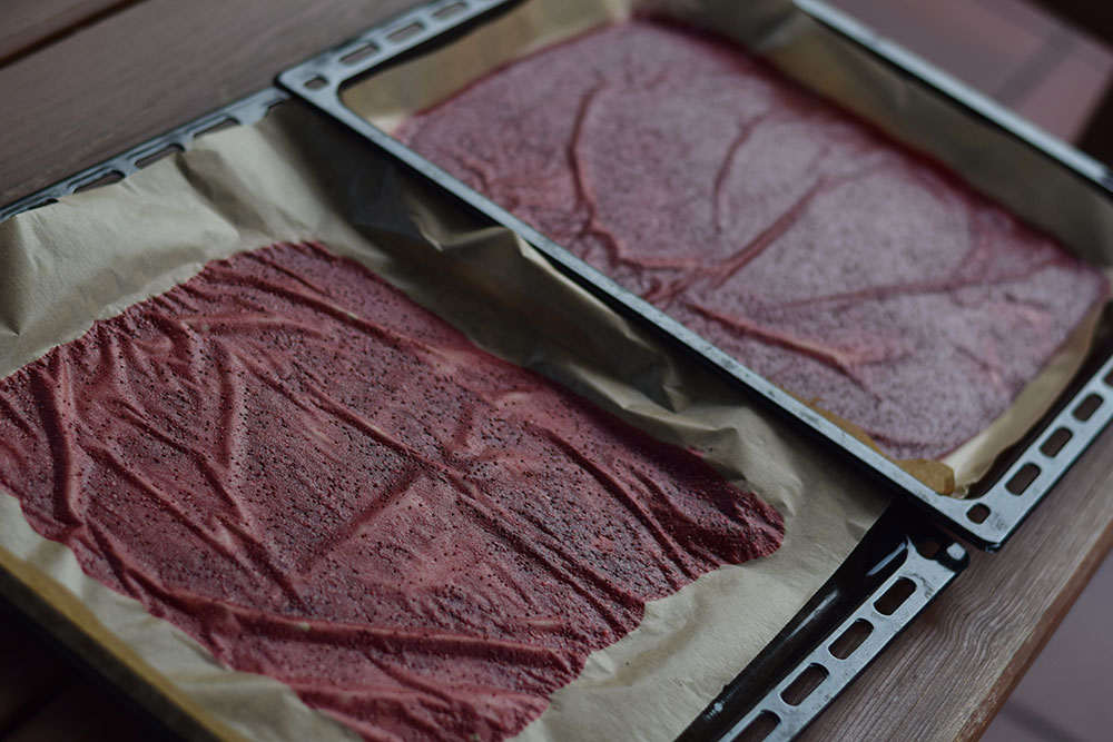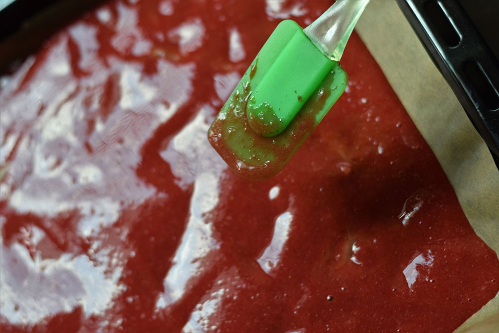 Mixované ovocie roztrieme rovnomerne do tenkej vrstvy, ale netreba sa snažiť o vrstvičku tenučkú ako papier, tá prirýchlo preschne a je priveľmi jemná a rada sa láme, pokojne tie 2 mm, aj 3 – ako sa podarí.