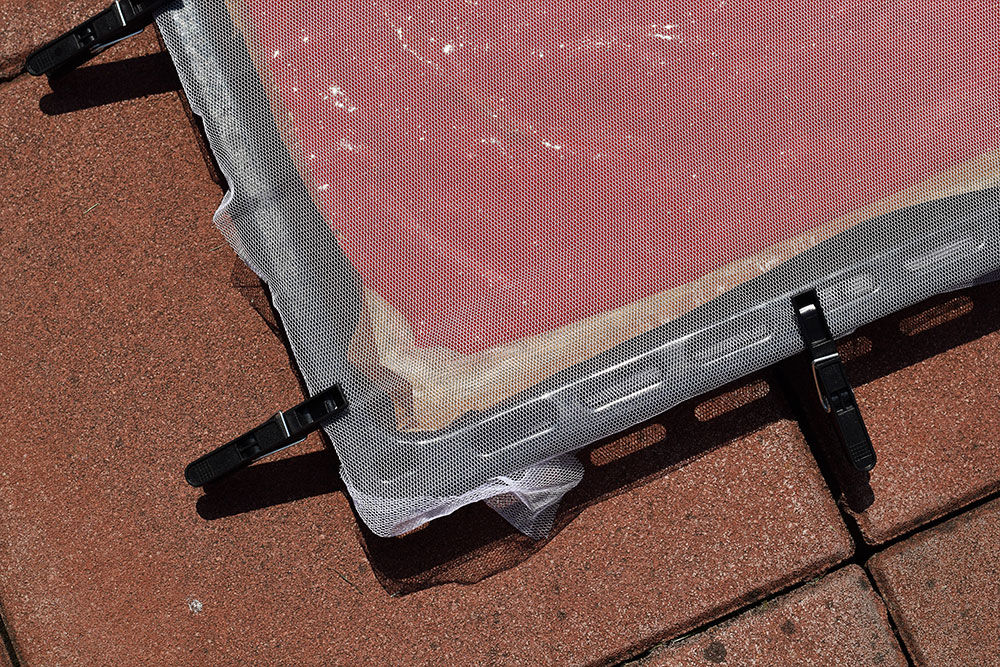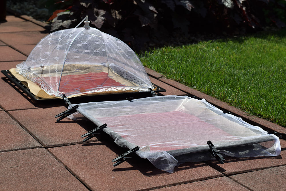 Rozotreté ovocie prikryjeme, aby nám tam nenaskákali mušky, mravce a iná háveď. Používam záclonkový prekrývač na záhradné stolovanie – ten je inak výborný, ale mám len jeden. Ponad ďalší plech naťahujem kúsok tylu. Stačí prichytiť štipcami, drží to aj vo vetre.