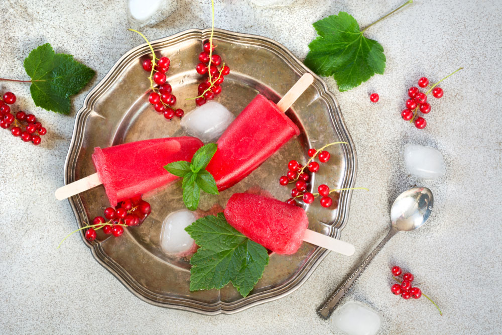 500 g očistených ríbezlí, šťava z 1 citróna. Rozmixujeme, pridáme vychladnutý sirup zo 120 ml vody a 120 g cukru. Prepasírujeme. Za občasného premiešania mrazíme päť hodín. Rozmixujeme, primiešame penu z jedného bielka, znovu zmrazíme.