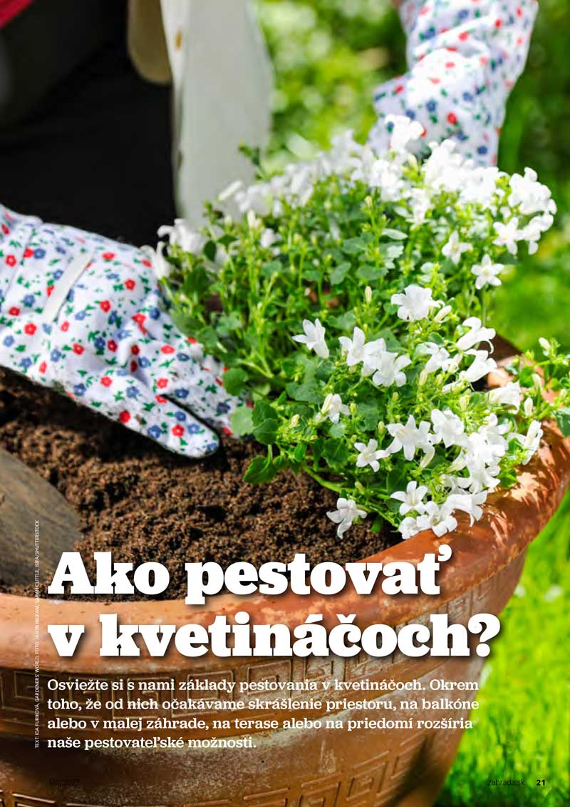 Venujeme sa aj letničkám, keďže máj je hlavné obdobie ich výsadby do záhonov aj do kvetináčov. Apropo, nádoby a kvetináče. Poradíme, aké zvoliť a ako v nich pestovať nielen okrasné druhy, ale aj čili papriky či nízke ovocné druhy. Čoskoro začne sezóna šťavnatých a sladkých jahôd. V tomto čísle nájdete porovnanie úrody ôsmich odrôd jahôd vysadených v kvetináči v ich prvom roku, spolu s kompletným sprievodcom ich pestovania. Zistíte tiež, čo pestovať na zatienenom záhone a ako v záhrade predchádzať výskytu komárov.