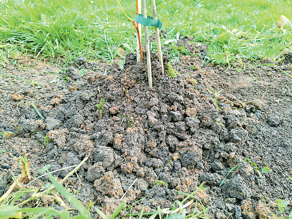 Sadenicu vložíme do jamy a skontrolujeme, či je hĺbka jamy dostatočná. Koreňový bal ručne prihrnieme zeminou zmiešanou s hnojivom.