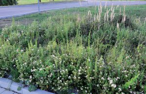 Cieľové trvalky prerastá v záhone s mulčovacou textíliou a bez údržby dva roky po založení množstvo buriny.