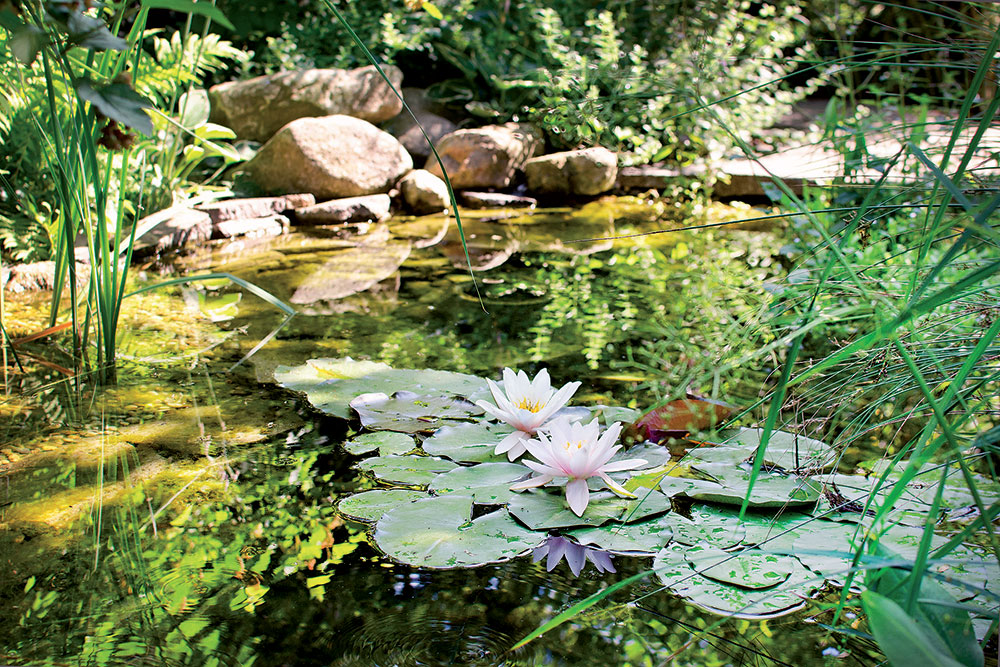 Hneď vedľa altánku je malé jazierko s objemom vody približne 5 kubických metrov. Jej čistotu zabezpečuje filtrácia, okysličenie malý vodopád a špeciálny okysličovač. Ten je dôležitý pre okrasné kapry a karasy, ktorých pred 12 rokmi kúpili 20 kusov a dnes je ich okolo 100. „Najstaršie z rýb majú práve toľko rokov,“ hovorí pani Betka. „Raz za rok jazierko čistíme. Púšťame sa do toho v rovnakom čase, keď kvitne zlatovka. Načasovanie je dôležité, voda vtedy už nie je až taká studená a neskôr by sme polámali pučiace lekná. Teším sa, ako krásne tento rok zakvitli lekná, ktoré v hĺbke 1,3 metra nechávame cez zimu v jazierku.“