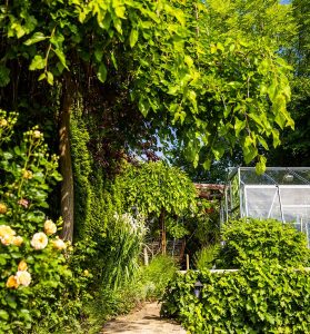 Najväčšiu plochu na pozemku tvorí okrasná záhrada. Do úžitkovej časti vedie vlastnoručne vyskladaný chodník lemovaný z jednej strany levanduľami a z druhej ružovým záhonom. „Ruže sú moje najobľúbenejšie rastliny,“ pokračuje pani Betka. Chodník vedie popod pergolu porastenú ružami, ďalej popri skleníku až na koniec záhrady, kde sú vyvýšené záhony na ovocie, zeleninu a bylinky.