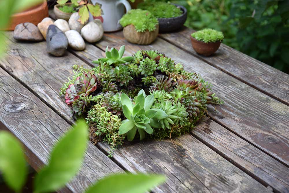 Keďže sa do nej vojde výrazne obmedzené množstvo pestovateľského substrátu, zvolíme len nenáročné, ideálne kobercovo rastúce skalničky. Krásny veniec na stôl môže vzniknúť napríklad zo skalných ruží (Sempervivum) a rozchodníkov (Sedum). Obidva spomenuté rody sú schopné rásť aj v naozaj extrémnych podmienkach. Vďaka sukulentnému charakteru im vyhovuje plné slnko a dobre znesú aj nedostatok vody.