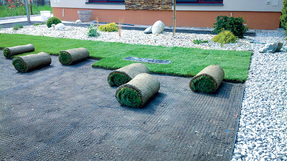 Na skosených hranách ukladáme trávnu mačinu tak, že sa bude prekrývať aj s dlažbou. Tieto miesta dodatočne zrežeme, prípadne použijeme vhodné kúsky do rohov či na opravu úzkych miest.