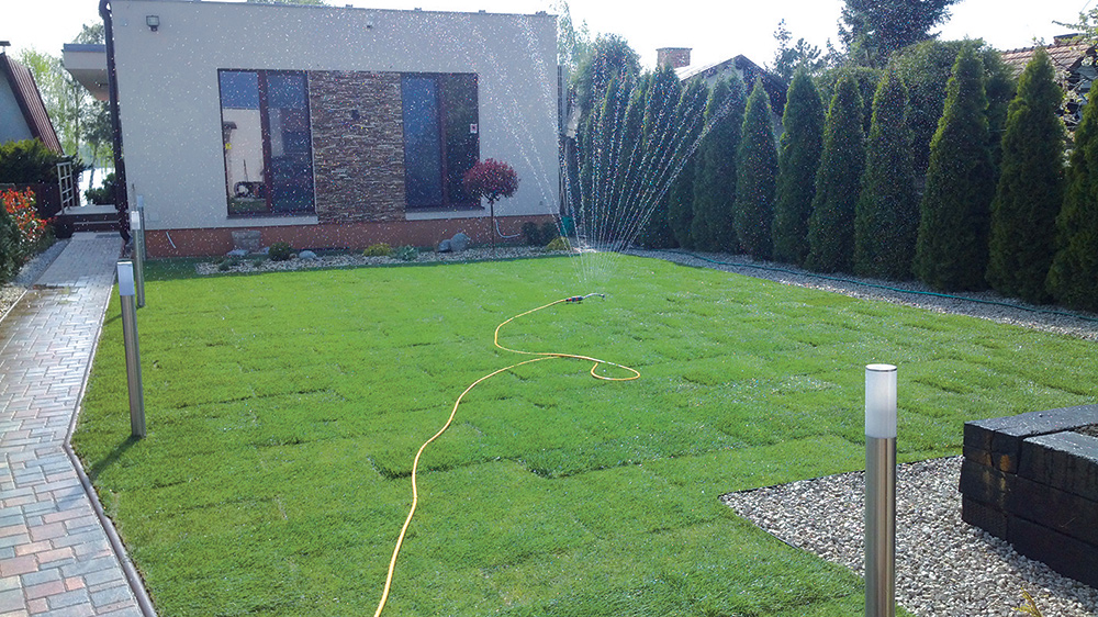 Čerstvo založený trávnik na záver dôkladne zalejeme. Nasledujúci týždeň by mal byť trávnik ako ryžové pole – mal by dostávať maximum vlahy, aby sa dobre zakorenil.