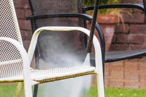 Záhradný nábytok dobre vyčistí aj tlaková voda. Nerobíme to ale na trávniku, mohli by sme si ho zničiť.