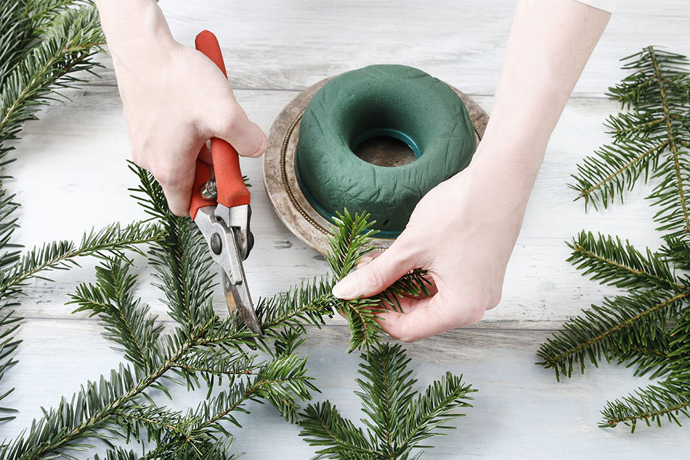 Pred zapichnutím vetvičky do aranžovacej hmoty z jej konca otrháme ihličie. Tento detail je veľmi dôležitý, aby vetvičky v hmote dobre držali a nemali tendenciu vypadávať.