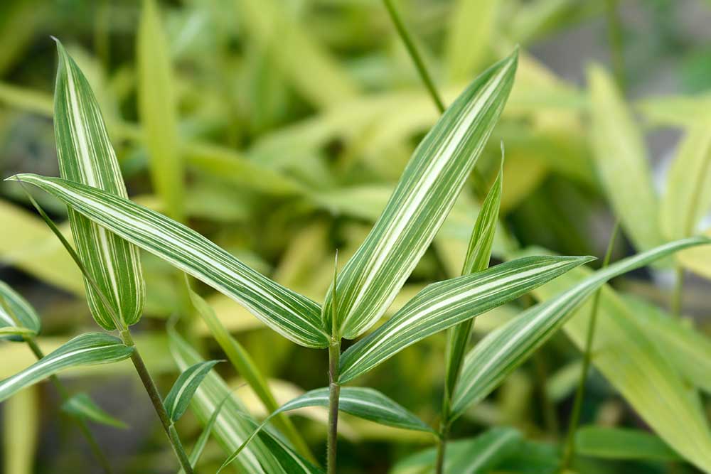- druhy s panašovanými listami: Pleioblastus viridistriatus – najkrajšie sú na slnečných miestach