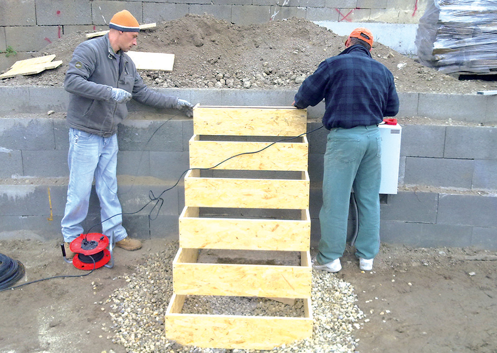 Hotové debnenie uložíme na štrkovú drenáž, ktorá zabráni hromadeniu vody pod schodiskom. Aby mala účinok, jej hrúbka nesmie klesnúť pod 10 cm.
