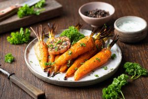 - Pečieme celé baby mrkvičky (netreba ich ani lúpať, stačí dobre umyť) v olivovom oleji a octe z červeného vína, s cesnakom a vetvičkami tymianu.