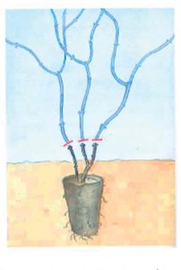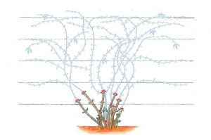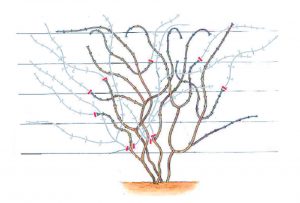 Pri systematickom ošetrovaní však uprednostňujeme výsadbu kontajnerovaných silných rastlín, ktorých výhony skrátime po výsadbe na 15 – 20 cm od zeme, aby sme podporili ako ich zakorenenie, tak i rozkonárenie rastlín. Na ďalší rok vyberieme v predjarí 5 – 7 silných výhonov na vytvorenie hlavnej kostry a priviažeme ich rozložené do šírky k podpere. V ďalších rokoch režeme len výhony zatieňujúce spodný obrast a výhony prerastené či rastúce von zo steny na 2 – 3 púčky, aby sme aj takto podporili kvitnutie.