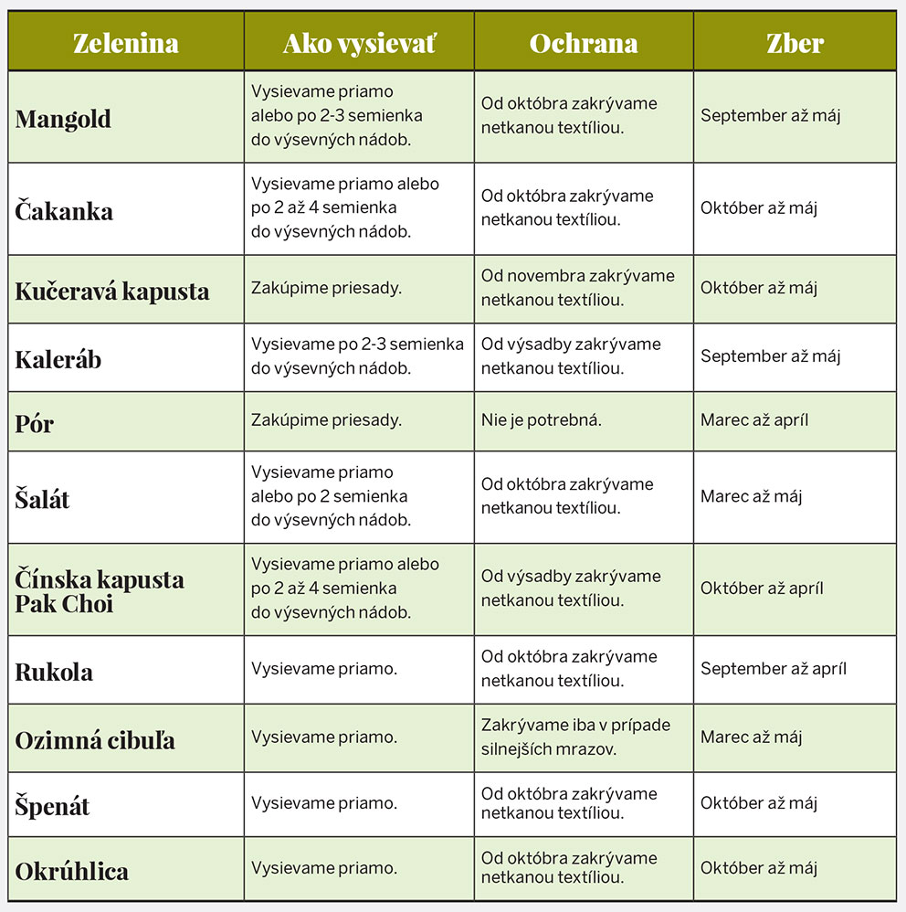Po zbere jarnej a čiastočne aj letnej úrody sa nám v záhone uvoľní dosť miesta, ktoré môžeme využiť na výsevy. Snažíme sa dodržať pravidlo, že na miesto nevysievame plodinu z rovnakej čeľade. Napríklad po cesnaku a cibuli nevysievame pór a ozimnú cibuľu, po jarných a letných hlúbovinách nevysádzame kapustovité rastliny. Pri výseve a výsadbe zeleniny myslíme na to, že ju budeme zakrývať netkanou textíliou. Preto ju vysievame a vysádzame tak, aby sme ju vedeli následne dobre zakryť, buď do blokov, alebo do riadkov. Biela netkaná textília chráni nielen pred pôsobením mrazov, ale aj pred škodcami, ktoré môžu byť teraz v lete v záhrade namnožené práve z prvej úrody. Príkladom sú molice alebo skočky, oba významné škodce hlúbovín a skočky aj rukoly. Šaláty vysádzame v spone cca 20 × 20 cm, rastliny s väčšími listami, ako mangold alebo kapustovité, v spone cca 30 × 30 cm.