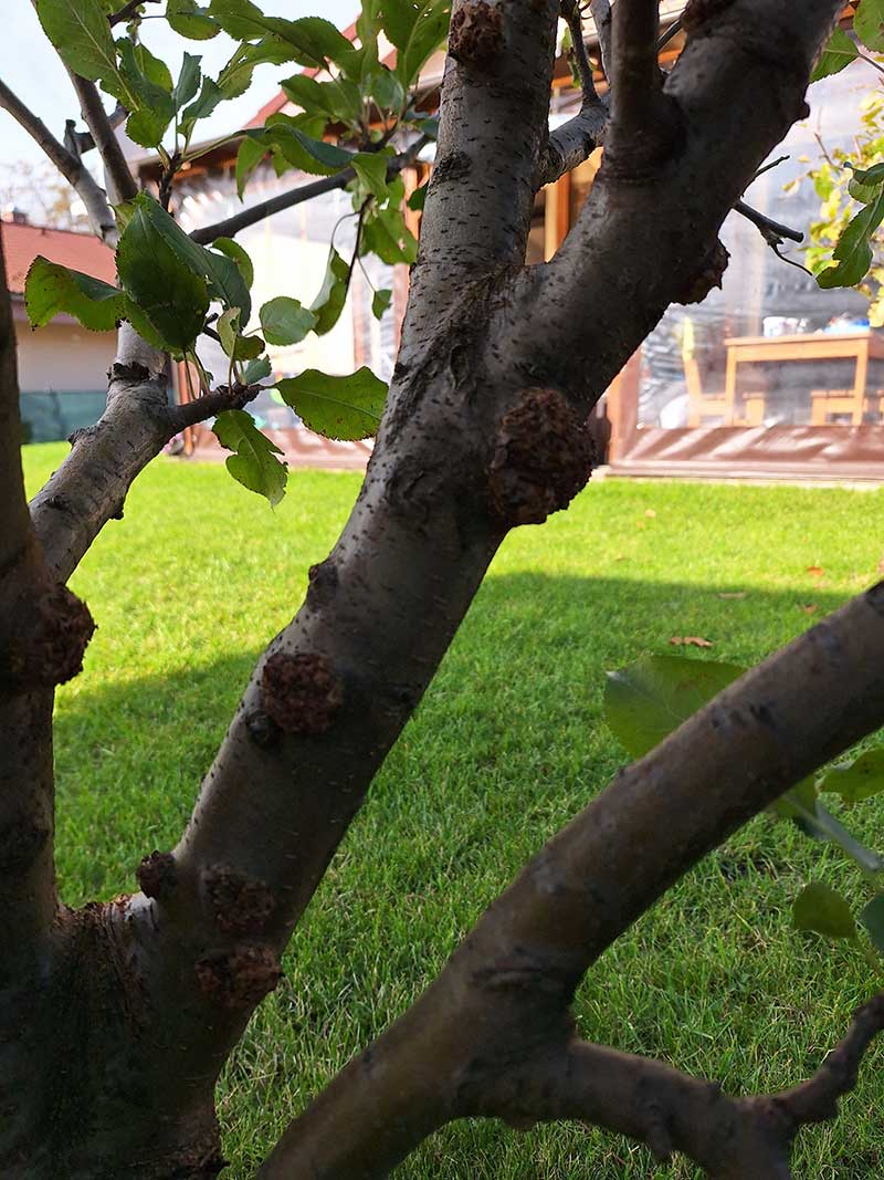 Podľa fotky ide o genetickú bradavičnatosť jabloní, čo je genetická porucha. Spôsobuje tvorbu bradavičnatých korkových výrastkov na konároch. V minulosti ju fytopatológovia klasifikovali ako chorobu, no v 21. storočí sa považuje za poruchu, nie za patogénnu infekciu.